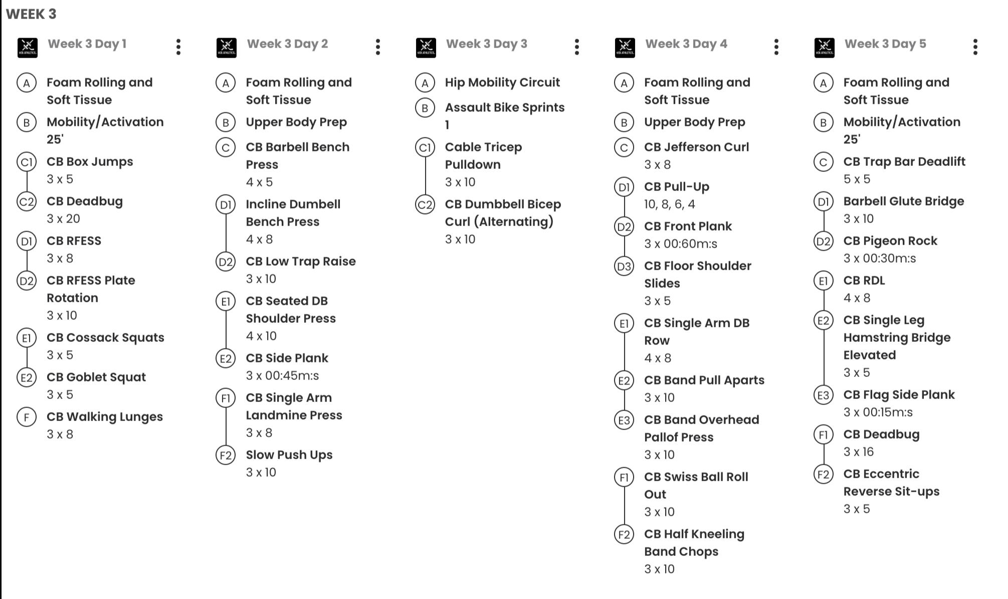 ⦿ Weeks 1–2: Prep + Mobility + Strength⦿ Weeks 3–6: Strength Development⦿ Week 7: Active Recovery⦿ Weeks 8–11: Strength + Power⦿ Weeks 11–13: Speed + Conditioning